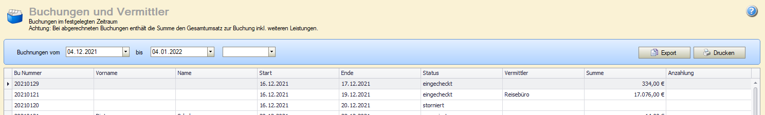 Hier können Sie sich Ihre Buchungen für den gewünschten Zeitraum anzeigen lassen.