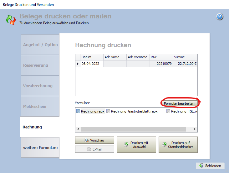 Außerdem kommen Sie über „drucken“ des jeweiligen Formulars und „Formular bearbeiten“ in den Report-Designer und können auch hier die Formulare anpassen.