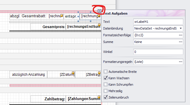 Dazu muss das betreffende Formular aus der Liste das angebotenen Formulare ausgewählt werden. Diese finden sie unter Stammdaten > Formulare. Per Klick auf „Bearbeiten“ wird der Formular-Entwurf im Report-Designer geöffnet. Dort kann jedes Feld ausgewählt und bearbeitet werden (Schrift, Farbe, Ausgabe-Format).