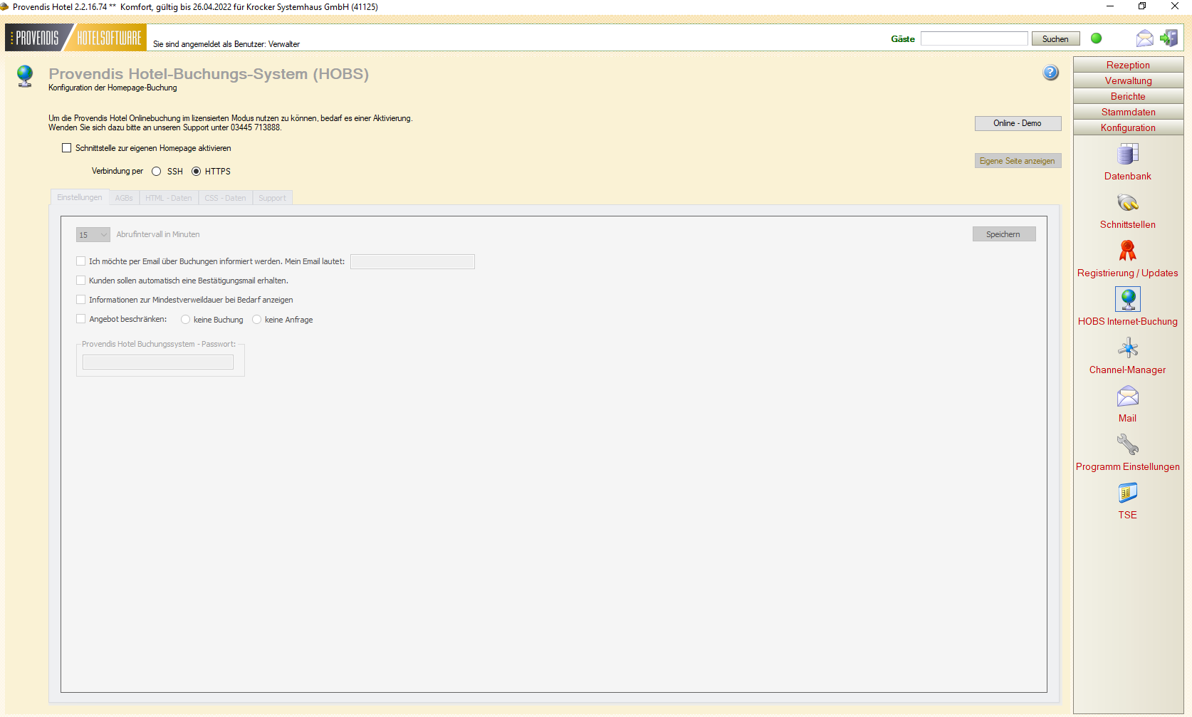 Um ein Formular zur Buchungsanfrage auf Ihrer Seite einzubinden, wählen Sie im Menüpunkt Konfiguration >> Internetbuchung den Karteireiter „HOBS Internet-Buchung“ und aktivieren sie die Schnittstelle mit einem Häkchen unter „Schnittstelle für eigene Homepage aktivieren“ und Verbindung per: "HTTPS".