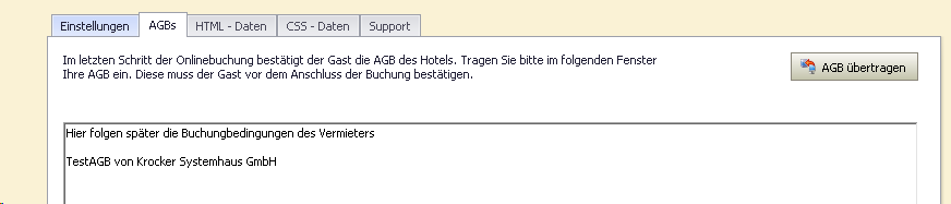 Tragen Sie hier Ihre Rechtstexte wie Buchungsbedingungen bzw. Ihre AGBs zur Annahme von Buchungen ein. Mit „AGB übertragen“ werden die AGB auf der Homepage aktualisiert.