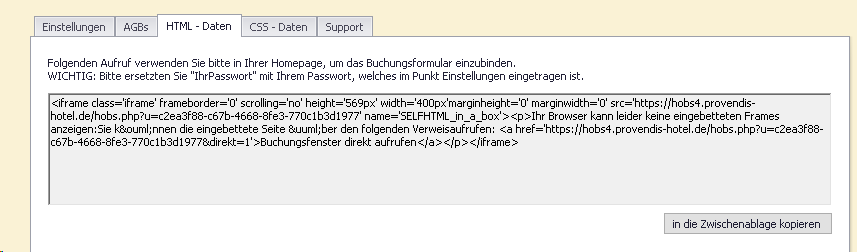 Die Provendis Hotelsoftware stellt Ihnen den fertigen Code zur Einbindung bereit. Wenn Sie Kenntnisse im Bereich Webdesign haben, kann der Code auch in gewissen Grenzen angepasst werden.