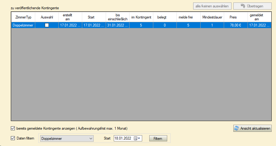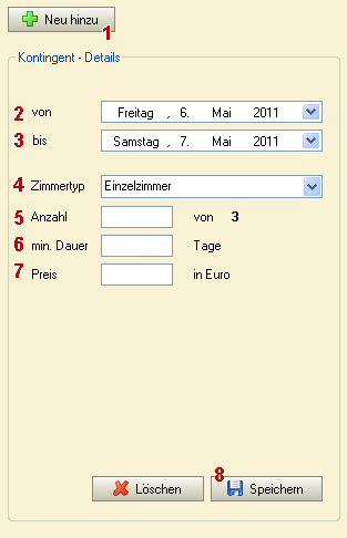 ACHTUNG! Das Anfangsdatum darf nicht vor dem Enddatum liegen und der Zeitraum darf sich nicht mit dem Kontingent des Zimmertyps überschneiden.