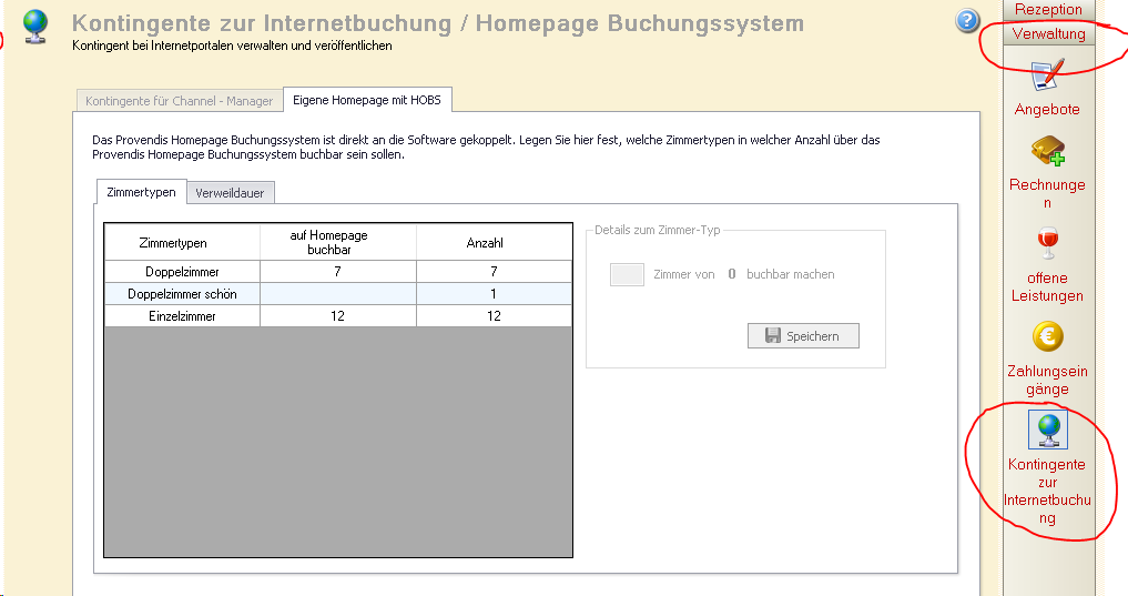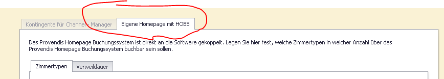 Zur Festlegung, welche Zimmer im HOBS buchbar sein sollen, wechseln Sie zu Verwaltung > Kontingente zur Internetbuchung und hier auf den 2. Tab „Eigenen Homepage mit HOBS.