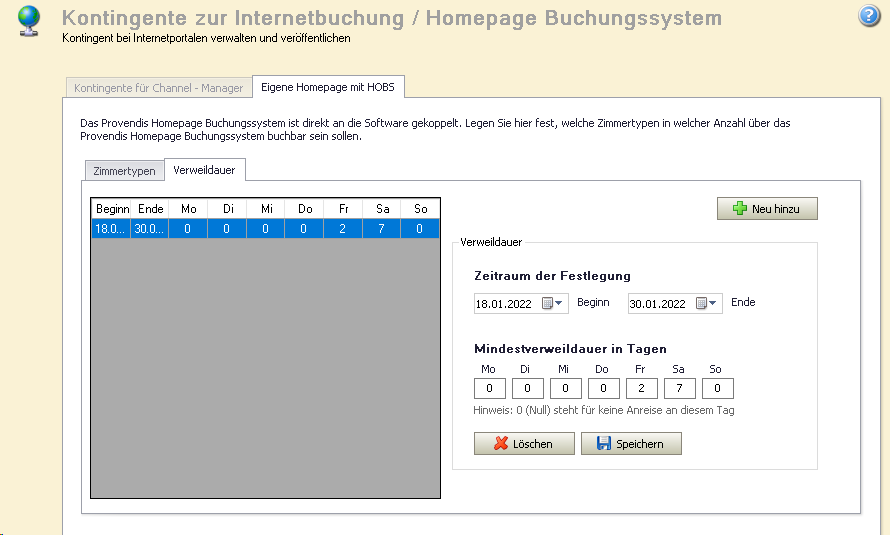 Über „Neu hinzu“ legen Sie eine spezielle Verweildauer an. Im Grundzustand nimmt das System an, dass alle Zimmertypen jeweils ab einer Nacht buchbar sein sollen. Über das Datum lässt sich der Zeitraum der Festlegung einschränken, so z.B. auf ein Wochenende.