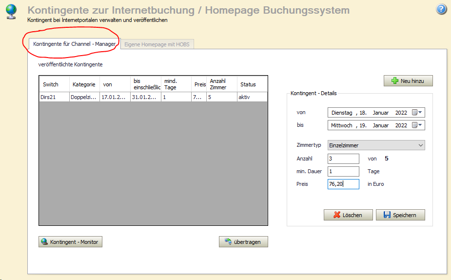 Über Verwaltung >> Kontingente zur Internetbuchung können Sie Ihre Kontingente für die Dirs21-Schnittstellen festlegen und bearbeiten.