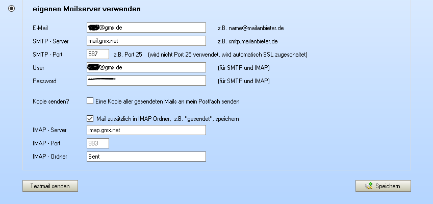 Mails zusätzlich per IMAP in den Ordner "Gesendet" oder "Postausgang" speichern> Setzen Sie den Haken und folgende Felder werden aktiv: |