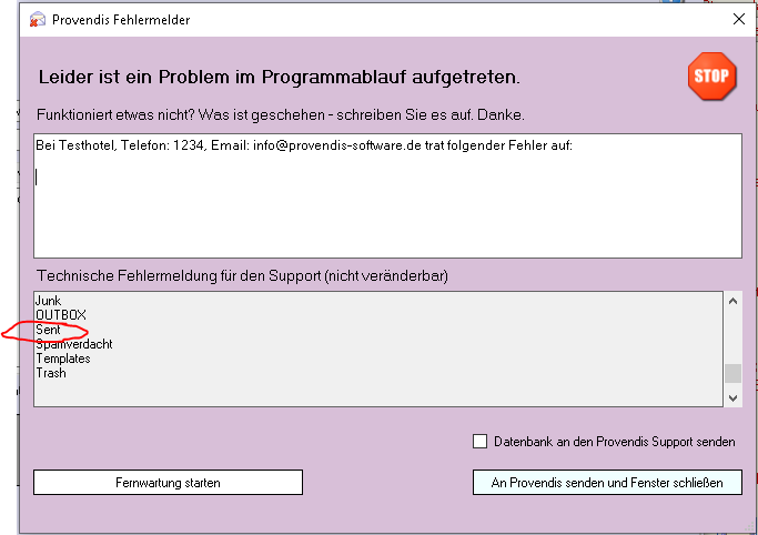 Sie erhalten den Namen ggf. aus der Fehlermeldung, welche Sie beim Versenden der ersten Testmail erhalten. Schauen Sie dazu in den unteren Teil der Fehlermeldung. Wie im folgenden Bild zu sehen ist, heißt der IMAP-Ordner in Beispiel-Fall "Sent".