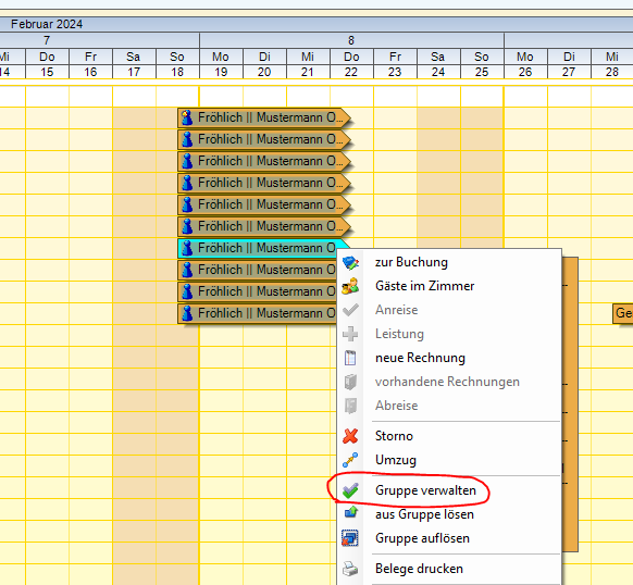 Rezeption > Zimmerspiegel: über die rechte Maustaste ist bei Klick auf eine Gruppenbuchung die Gruppenverwaltung zu erreichen.