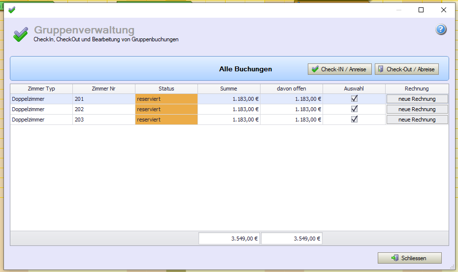 Die Gruppenverwaltung, verfügbar ab Version 2.2.18.77, ermöglicht das komfortable Ein- und Auschecken einer ganzen Gruppe, eine Übersicht über die einzelnen Buchungsstati der Gruppe sowie das Erstellen der einzelnen Rechnungen für die Gruppe. Insbesondere bei großen Gruppen und bei vielen Zimmern mit verteilt eingebuchten Zimmern ist die Gruppenverwaltung hilfreich.