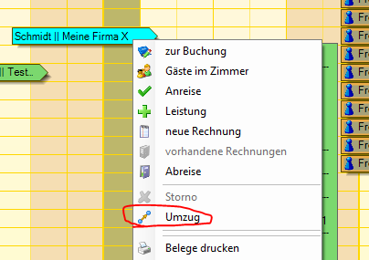Rezeption > Zimmerspiegel: Der Dialog Umzug ist über den Klick mit der rechten Maustaste auf eine Buchung zu erreichen.