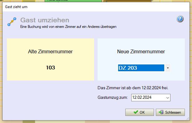 Änderung: Zimmerspiegel > Umzug: Umzug von Buchungen sind nun mit einer Auswahlbox der Zimmer möglich, um Umzüge "bildschirmhöheübergreifend" zu ermöglichen, also z.B. bei 50 Zimmern von Zimmer 1 zu Zimmer 50.