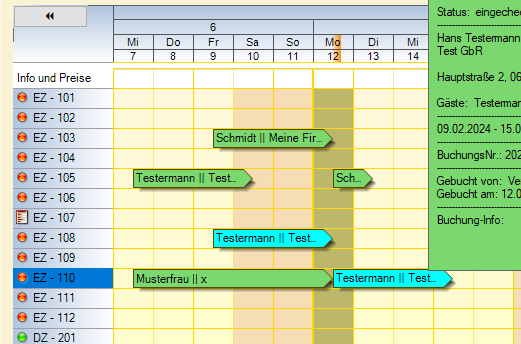 Sollte das ausgewählte Zimmer belegt sein, werden Sie gewarnt. Sollte das Zimmer erst ab einem bestimmten Datum frei sein, kann die Buchung gesplittet werden, wie im folgenden Beispiel zu sehen. Hierbei wurde die Buchung auf die aus Zimmer 108 auf die Buchung im Zimmer 110 gezogen. Das das Zimmer 110 bis zum 12.02. belegt ist, kann der Umzug erst zum 12.02. stattfinden.