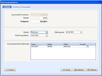 In Fenster „Anzahlung/Rechnungsdaten“ können Rechnungsdatum, Zahlart, Endpreis, Rabatt und Zahlungsziel geändert werden.