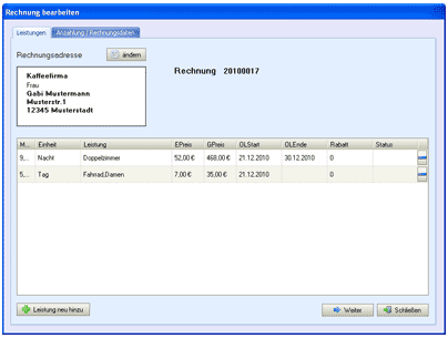 nachträglich der Rechnungsempfänger geändert werden. Weiterhin können vorhandene Positionen gelöscht oder neue Leistungen hinzugefügt werden.