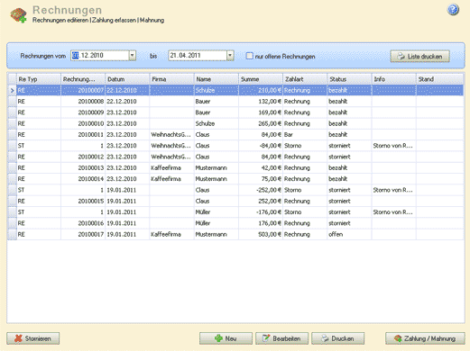 Zahlungen zu Rechnungen erfasst und Mahnungen gedruckt werden. (Siehe Punkt "Zahlungen/Mahnungen")