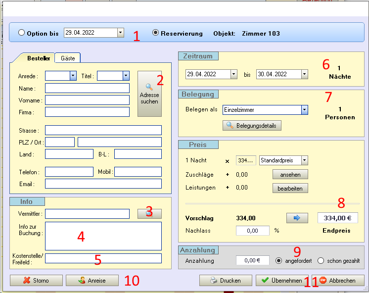 (9) Erfassung bzw. Anforderung von Anzahlung, wurde ein Anzahlung schon überwiesen, wird automatisch ein Zahlung auf dem Kundenkonto vermerkt. Prozentuale Anzahlungen lassen sich weiterhin im Druck-Center über Das Reservierungsformular anfordern.
