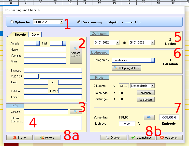 Anhand der roten Ziffern wird nachfolgend der Ablauf für eine Buchung erklärt.