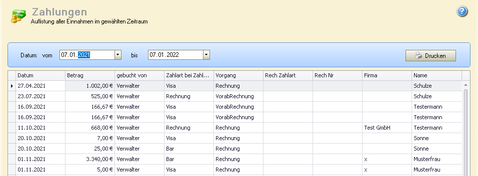 Die Zahlungsliste zeigt die getätigten Zahlungen für den gewünschten Zeitraum.