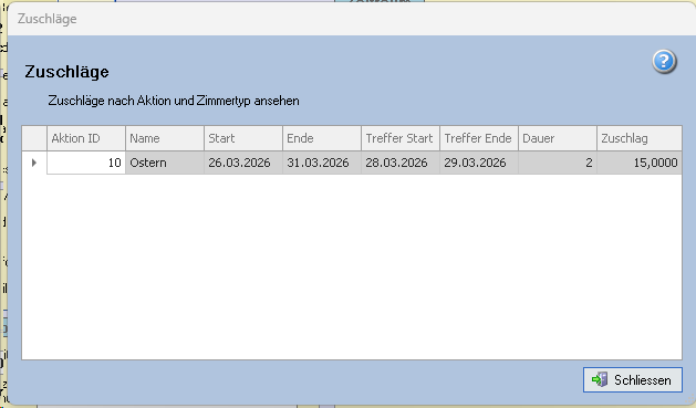 Rezeption Zuschläge Ansicht der aktuell verrechneten Zuschläge / Saisonpreise Diese Form ermöglicht die Übersicht über bestehende Zuschläge. Diese werden zeitgesteuert über Stammdaten > Saisonpreise und Zuschläge konfiguriert.